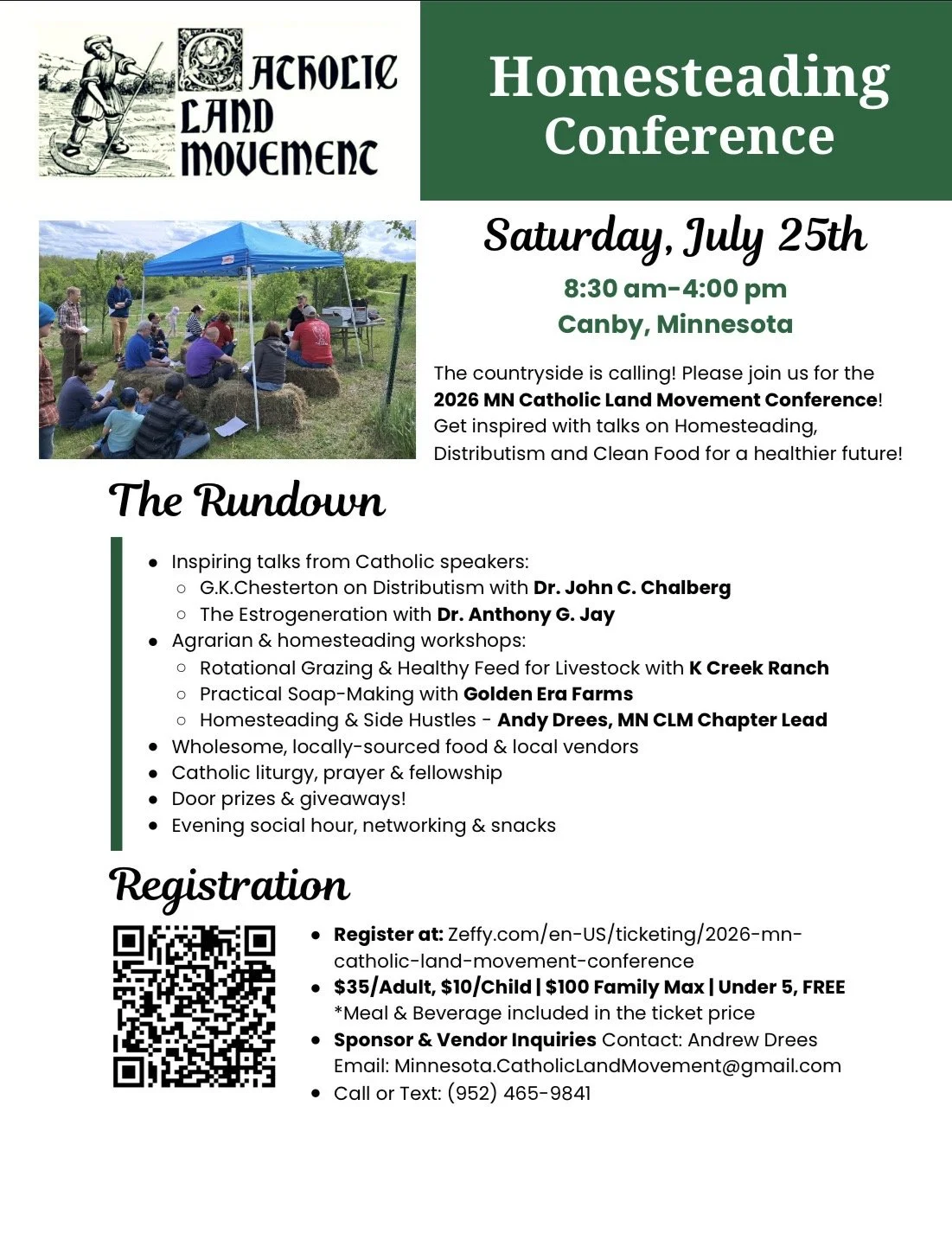 Minnesota Conference Saturday, July 25, 2026 8:30 AM 4:00 PM Google Calendar ICS Get your tickets here:https://www.zeffy.com/en-US/ticketing/2026-mn-catholic-land-movement-conference